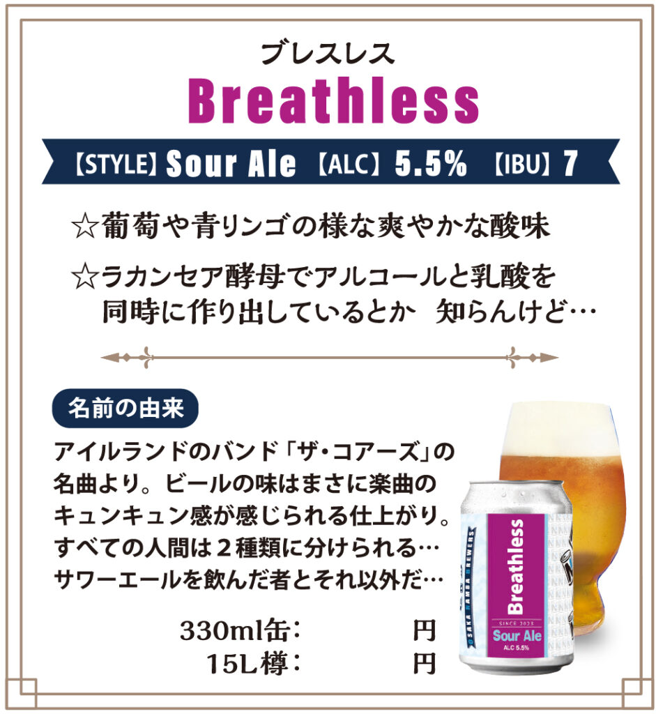 アイルランドのバンド「ザ・コアーズ」の名曲より。ビールの味はさておき楽曲のキュンキュン感が感じられる仕上がり。すべての人間は2種類に分けられる...サワーエールを飲んだ者とそれ以外だ...