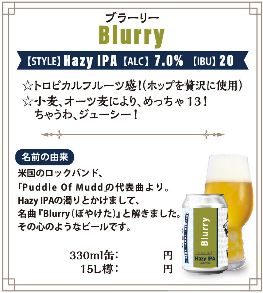 米国のロックバンド、「Puddle Of Mudd」の代表曲より。Hazy IPAの濁りとかけまして、名曲「Blurry (ぼやけた)」と解きました。そのようなビールです。